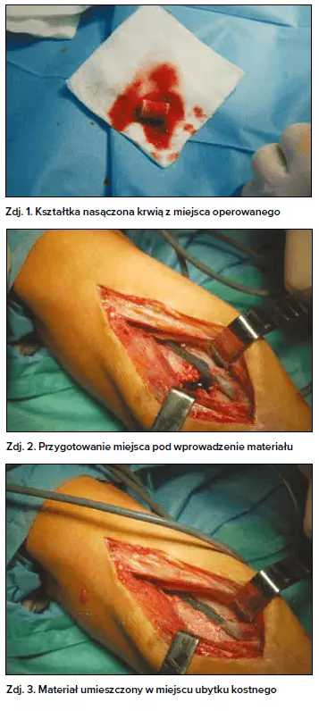 Objętość materiału do wszczepienia powinna zostać oszacowana przedoperacyjnie z wykorzystaniem dostępnych wyników badań obrazowych (TK, RTG, USG). Kształtka odpowiedniej objętości umieszczana była w 0,9% roztworze NaCl lub krwi pacjenta pobranej z miejsca operowanego na 10–20 minut. Czas ten bliski był zazwyczaj czynnościom przygotowania miejsca pod wszczepienie materiału, liczony od momentu uzyskania dostępu operacyjnego do miejsca potencjalnego zastosowania materiału. Po upływie wskazanego czasu materiał uzyskiwał swoje szczególne właściwości plastyczne, co można było sprawdzić przez użycie narzędzi chirurgicznych lub ugniatanie w palcach operatora. Nadmiar szacowanej objętości materiału przy ostatecznym pomiarze ubytku kości usuwano poprzez odcięcie skalpelem. Kompozyt wprowadzano następnie w uprzednio przygotowane miejsce z użyciem pobijaka lub przez ręczne domodelowanie. Kruszenie materiału z pozostawaniem jego drobin w tkankach miękkich operowanej okolicy uznano za zjawisko normalne i niepowodujące potencjalnych objawów niepożądanych. Obszar wszczepienia materiału w kolejnych etapach operacji pokrywano starannie tkankami miękkimi, starając się w ten sposób zapewnić ograniczenie przemieszczenia materiału z miejsca zastosowania.