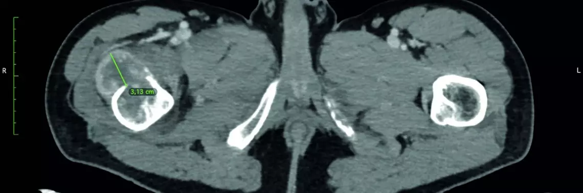 Kolejna operacja w użyciem okularów mieszanej rzeczywistości została wykonana u niespełna 40-letniego pacjenta w przebiegu leczenia raka jasnokomórkowego nerki, u którego doszło do złamania patologicznego bliższego końca kości udowej (ryc. 1).
