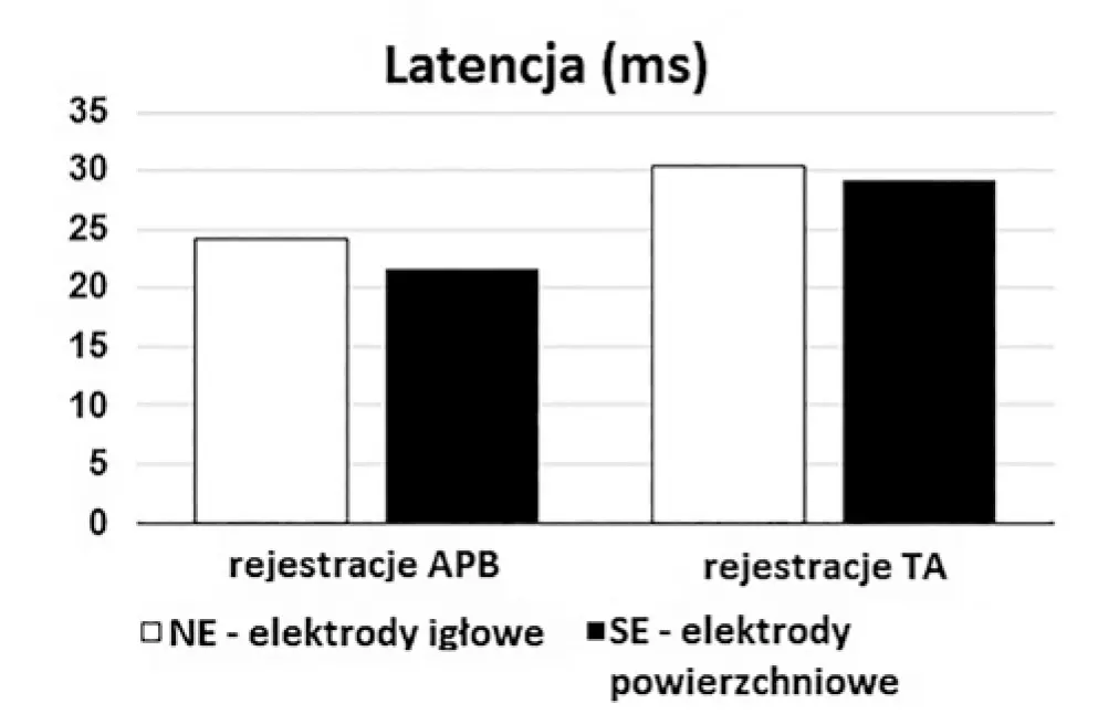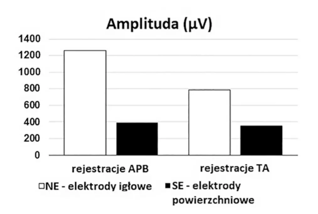 Amplitudy MEP zarejestrowane elektrodami powierzchniowymi (SE) osiągały wartości o ponad połowę mniejsze od rejestrowanych przy pomocy elektrod igłowych (NE). Średnie amplitudy MEP zarejestrowane z APB metodą SE wynosiły 390 µV, podczas gdy analogiczne metodą NE 1263 µV. Średnie amplitudy zarejestrowane z TA metodą SE wynosiły 354 µV, podczas gdy analogiczne metodą NE 786 µV. Latencje MEP zarejestrowane metodą SE z APB wynosiły średnio 21,6 ms, natomiast z TA 29,2 ms.