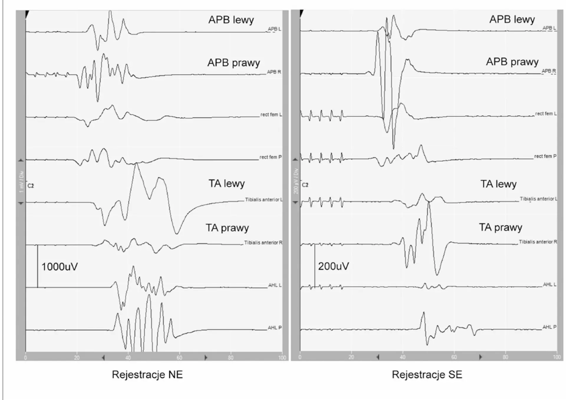 Ryc. 1. Przykłady rejestracji MEP odprowadzanych za pomocą elektrod igłowych (NE, po lewej) w porównaniu do elektrod powierzchniowych (SE, po prawej)