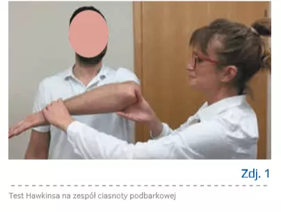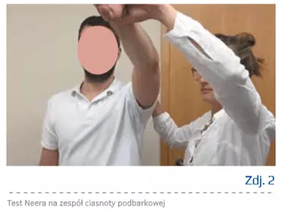 - pozytywne testy ciasnoty podbarkowej: test bolesnego łuku, test Hawkinsa, test Neera (zdj. 1, 2),