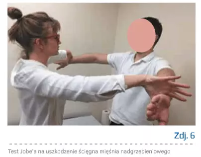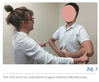 - pozytywne testy prowokacyjne: test Jobe’a, test belly–press, test opadania rotacji zewnętrznej ramienia (zdj. 6, 7).