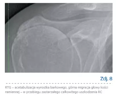 W RTG – bez uchwytnych patologii lub górna migracja głowy kości ramiennej, acetabulizacja wyrostka barkowego (zdj. 8).