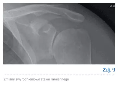 W RTG – widoczne zwężenie szpary stawu ramiennego, sklerotyzacja, wyrośla kostne, wysokie ustawienie głowy, odwapnienia guzka większego, zniekształcenie obrysu głowy (zdj. 9).